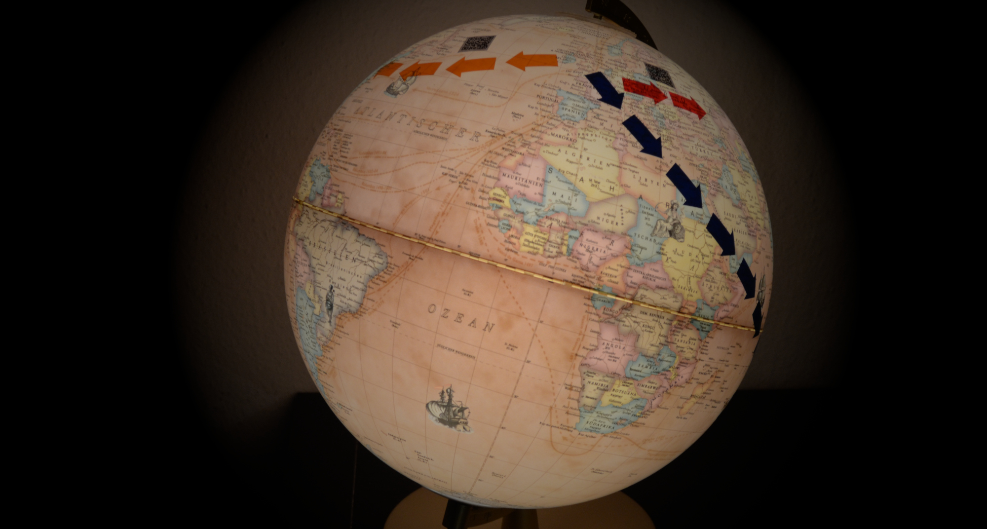 Unsere Idee bei diesem Projekt ist, die analoge und digitale Welt zu verbinden. Die historische Migration aus Europa machen wir sichtbar, indem wir einen Globus mit Migrationsrouten gestaltet haben; über QR-Codes an diesen Routen ist diese Seite hier mit weiteren Informationen verlinkt.